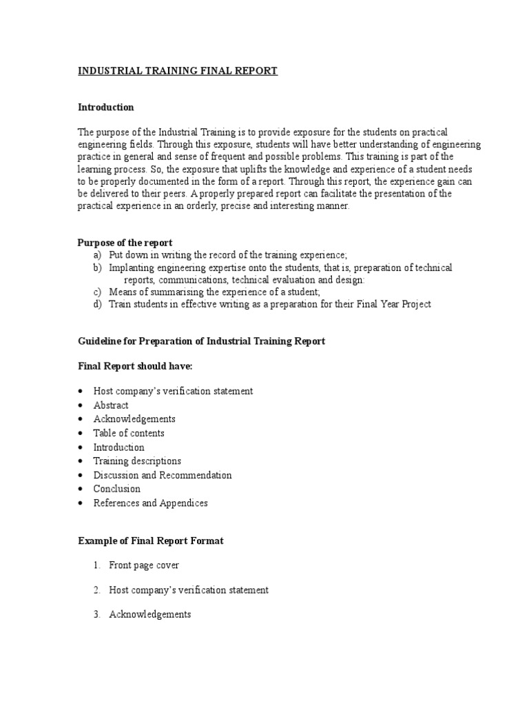 Up to 24 cash back RECOMMENDATION After 20 weeks undertake industrial at Inari Technology SdnBhd I would like to suggest both institute Politeknik Balik Pulau and Inari Technology SDNBHD must improve to make industrial training even more efficient and challenging in future. It is also written for the purpose of analysis. A training report is a business report that summarizes and documents the results of a companys training program.